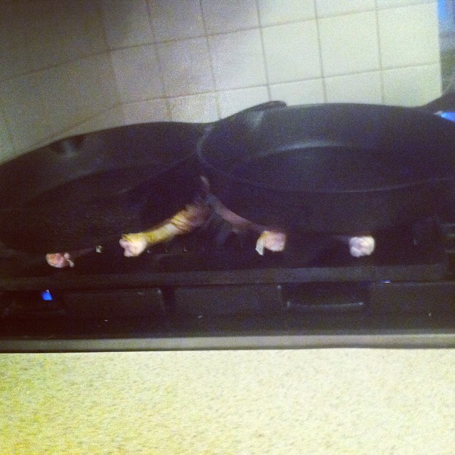 Cast iron panini. Pans on top are preheated in 500f oven for 1/2 hour. Brined hens are squished.