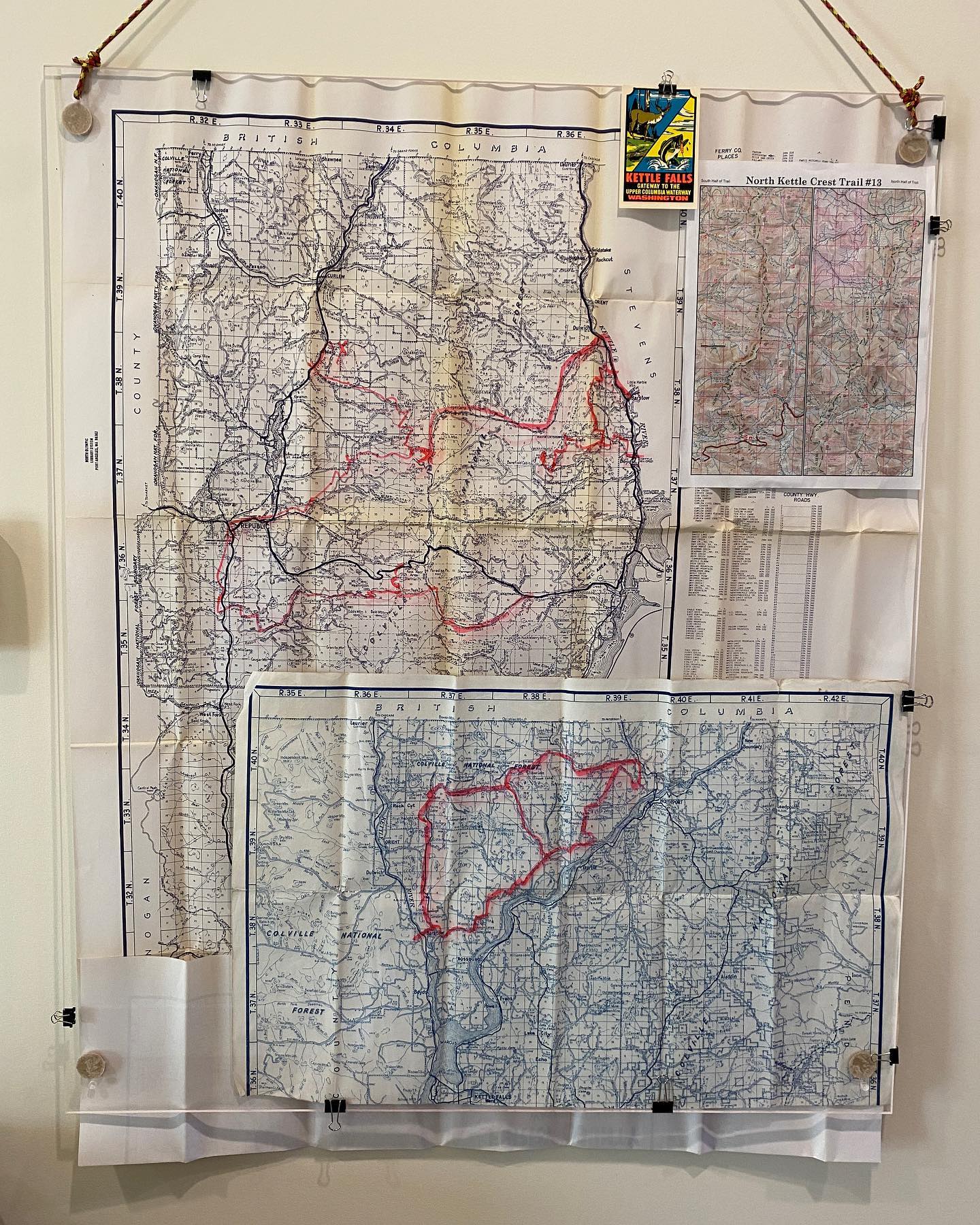 Let the planning commence. Top map: northern 1/2 of Ferry County. Bottom map: north 1/2 of Steven’s. Scoping a dirt road and single track route up’n o’er the KCT. And a couple forest road loops from Barstow.