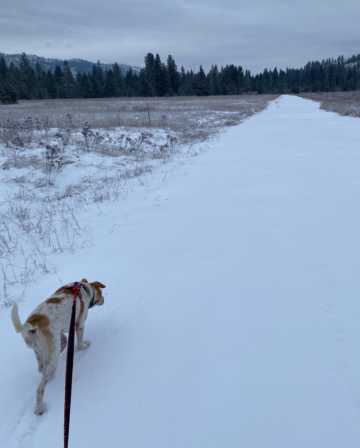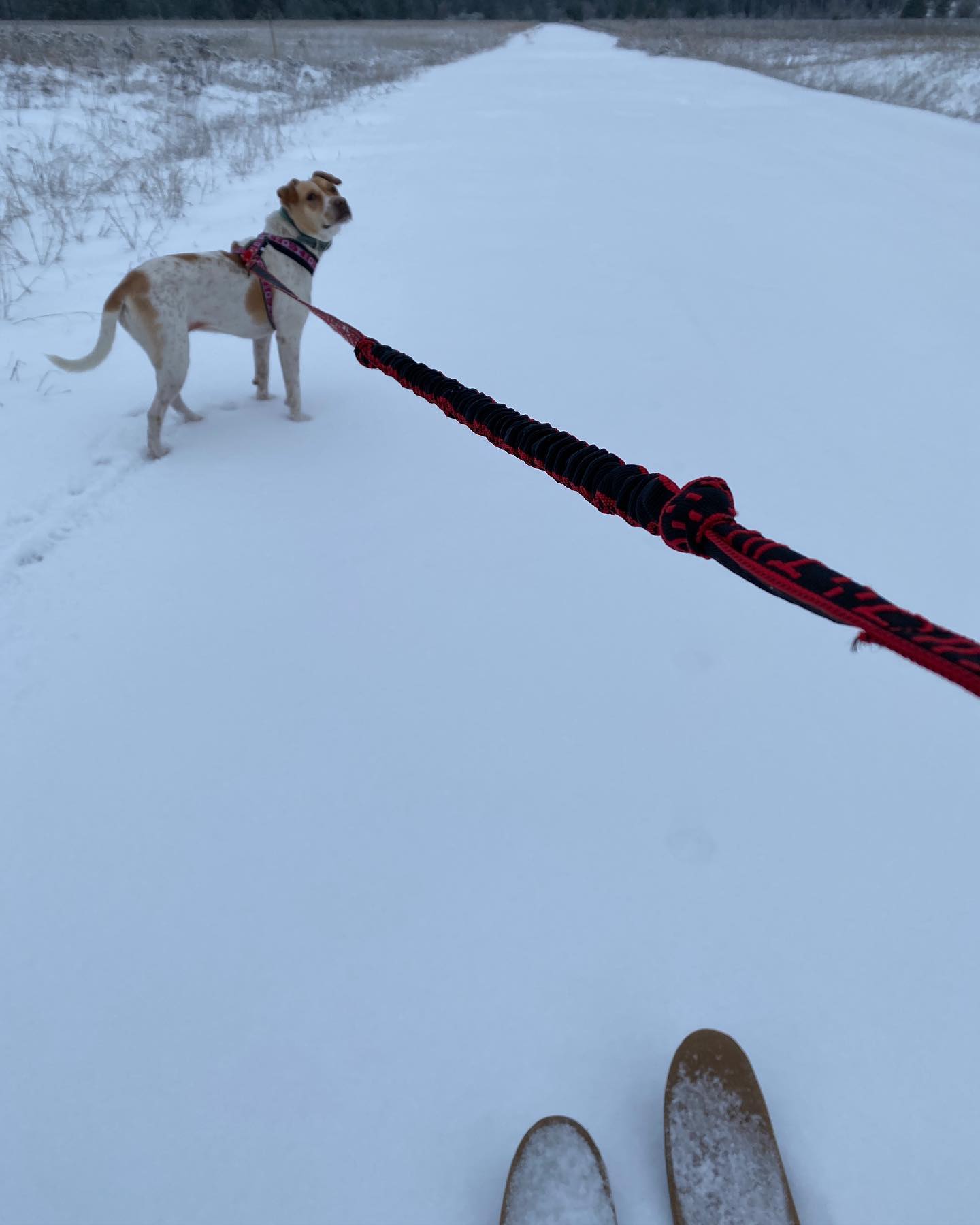 Dave is taking care of me! #skijoring with @daisydoodlethedog Love the @altai_skis. I call them “Curlew skis” (tomato-tomatoe, Kaiser blade-sling blade)... Bonus: Winter river and cougar prints too!