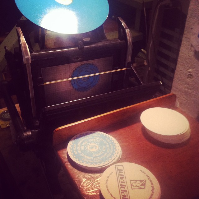 Knocking out #elephantbikes swag. #petessakepress #letterpress #beercoasters