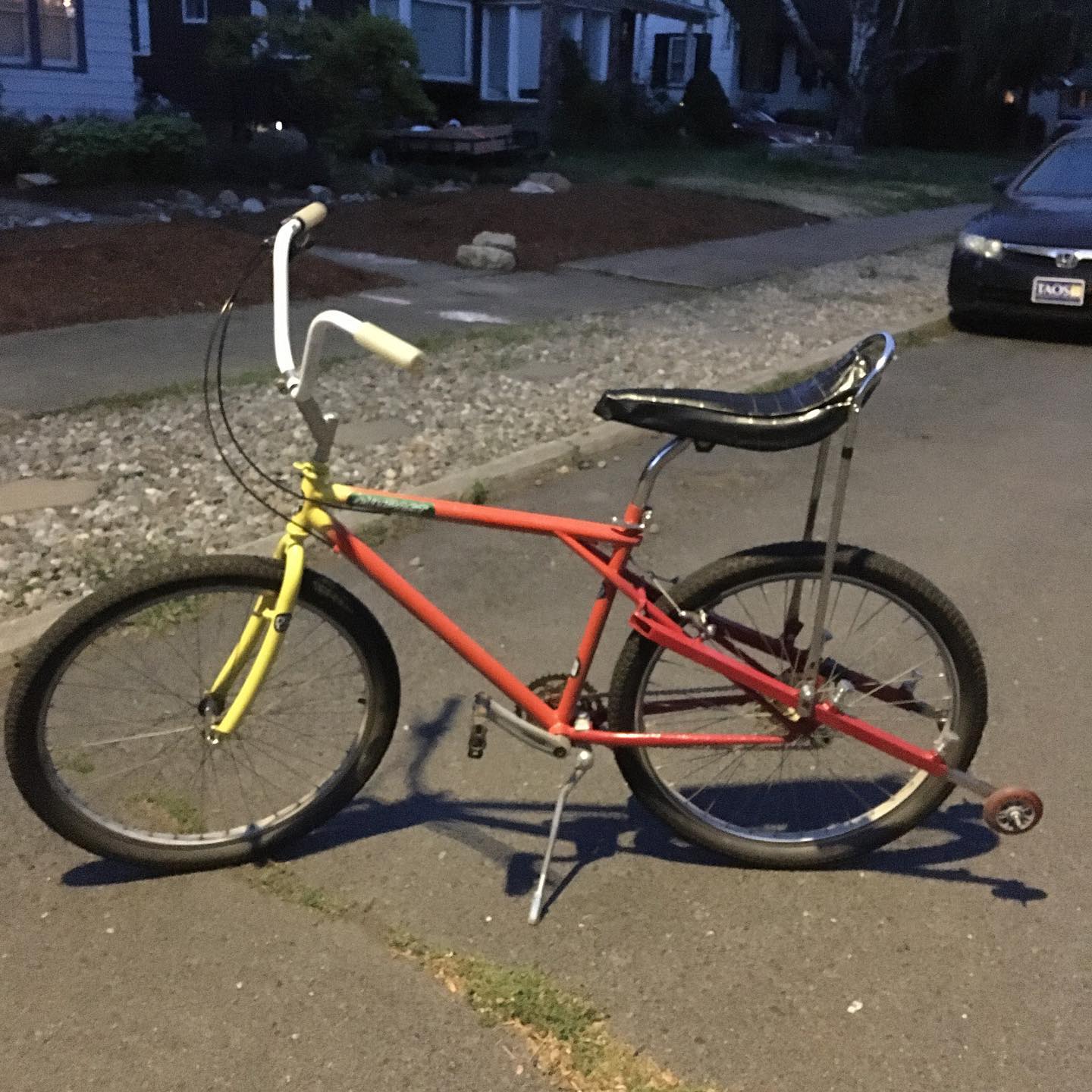 Behold! The return of @pat_sprute ‘s finest achievement (excepting the pump track—duh): the wheelie bike. Mine at last!