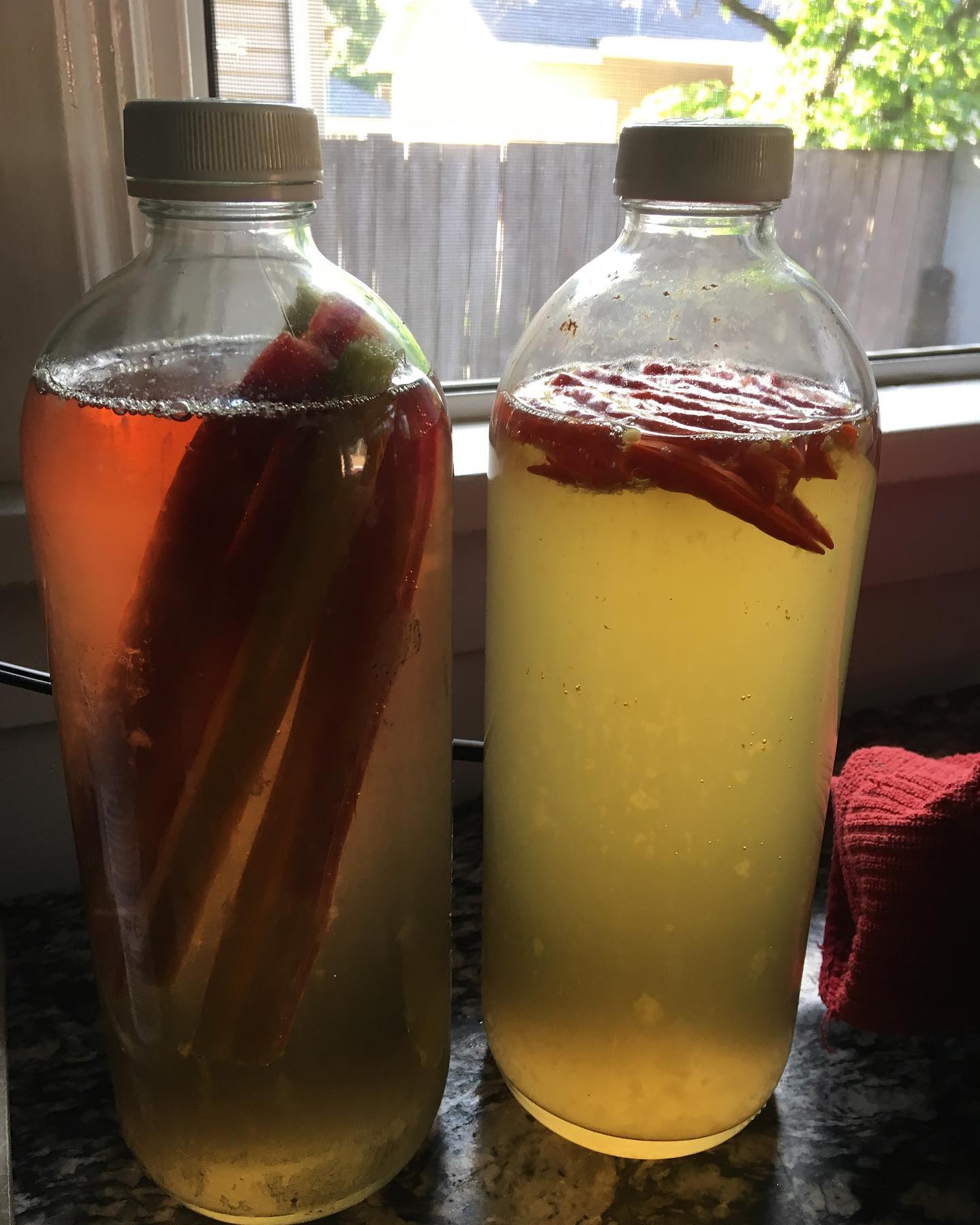 July is peak booch season around here. Rhubarb on the left. Chili on the right.
