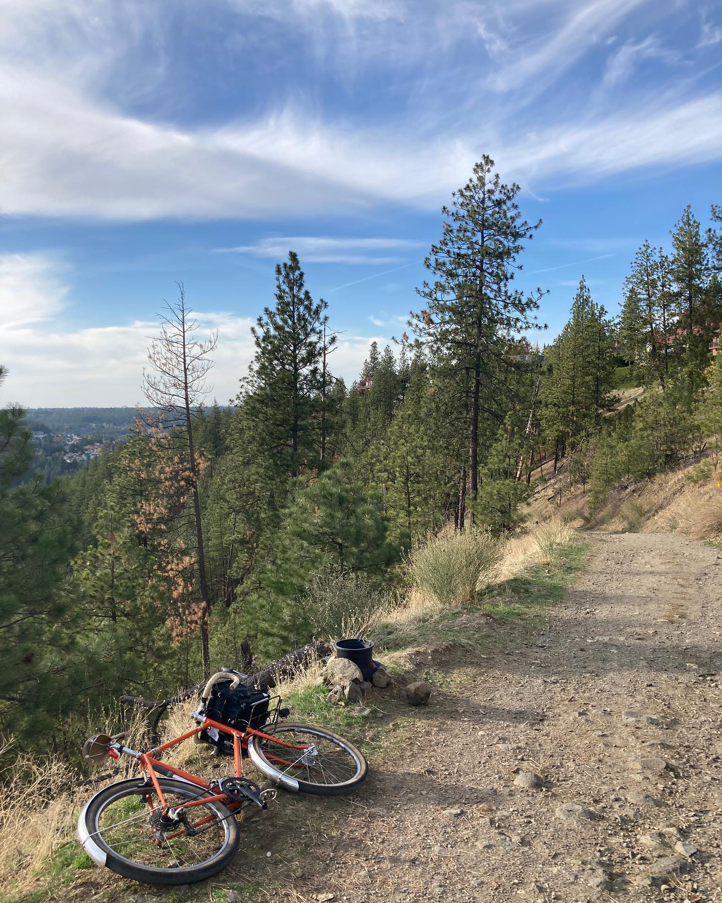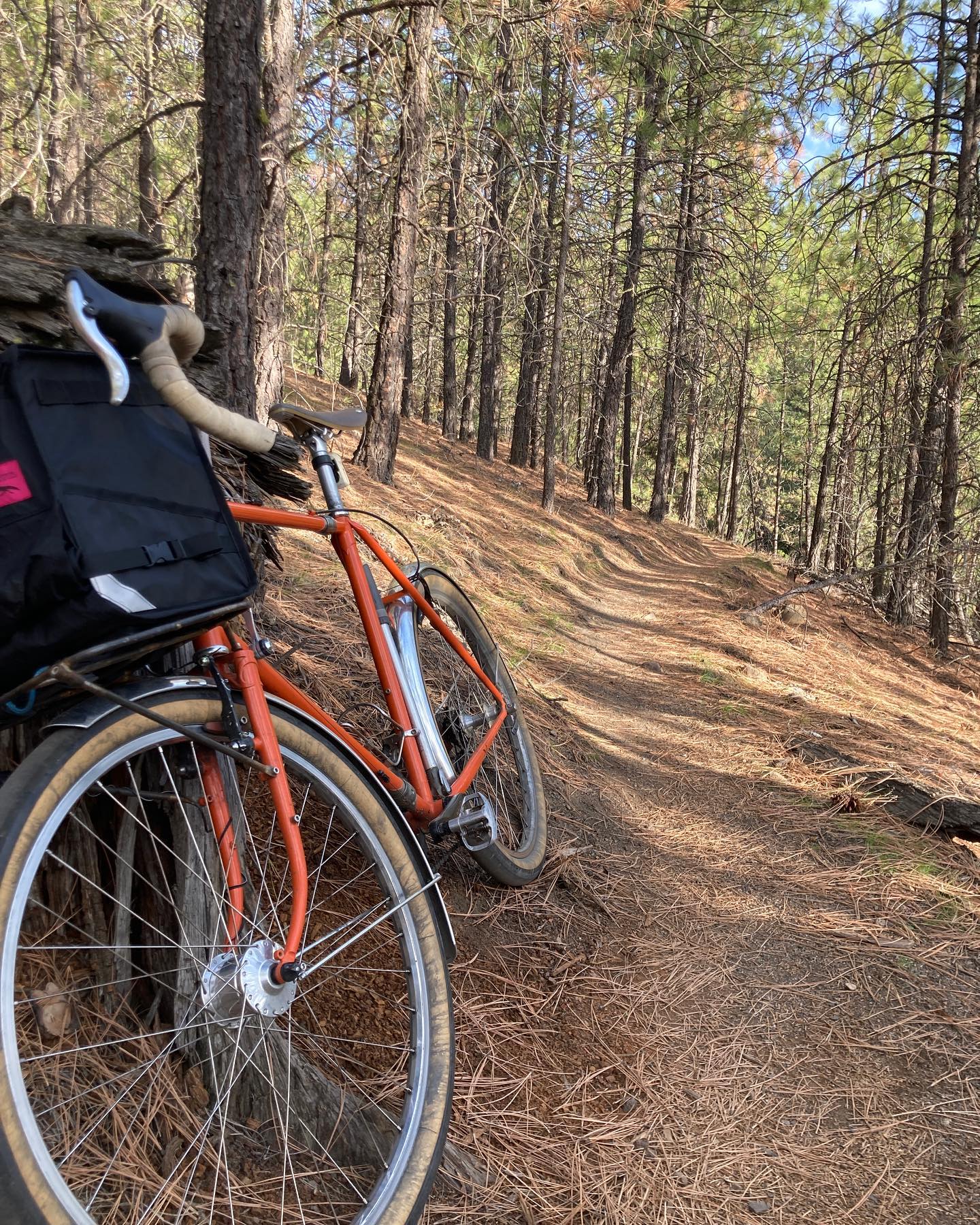 My buddy @alex.wetmore is loaning me his bike for a while. I think the last time I rode this was for a work trip to seattle 8? Years ago? He built the frame about a decade ago. There’s so much great about this bike and this platform just doesn’t make it easy to carry on and on… The NFE was spawned, in part, from this bike. It’s a 26” wheel, low trail, standard diameter-thin walled tubing travel bike. Components are boring but smart, serviceable, and work well. It’s powder coated in the only color that makes sense for this bike. It’s been far too long since I’ve ridden a bike like this regularly. I just took it for my daily high drive trails spin. This will be a great shit weather rain bike during breaks in the snow over the winter. And I plan to take a bunch of short regional tours on it next spring and summer. Then I’ll give it back. :)