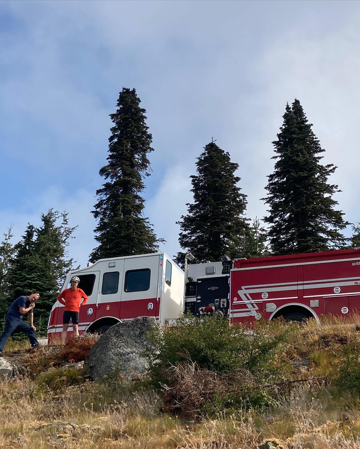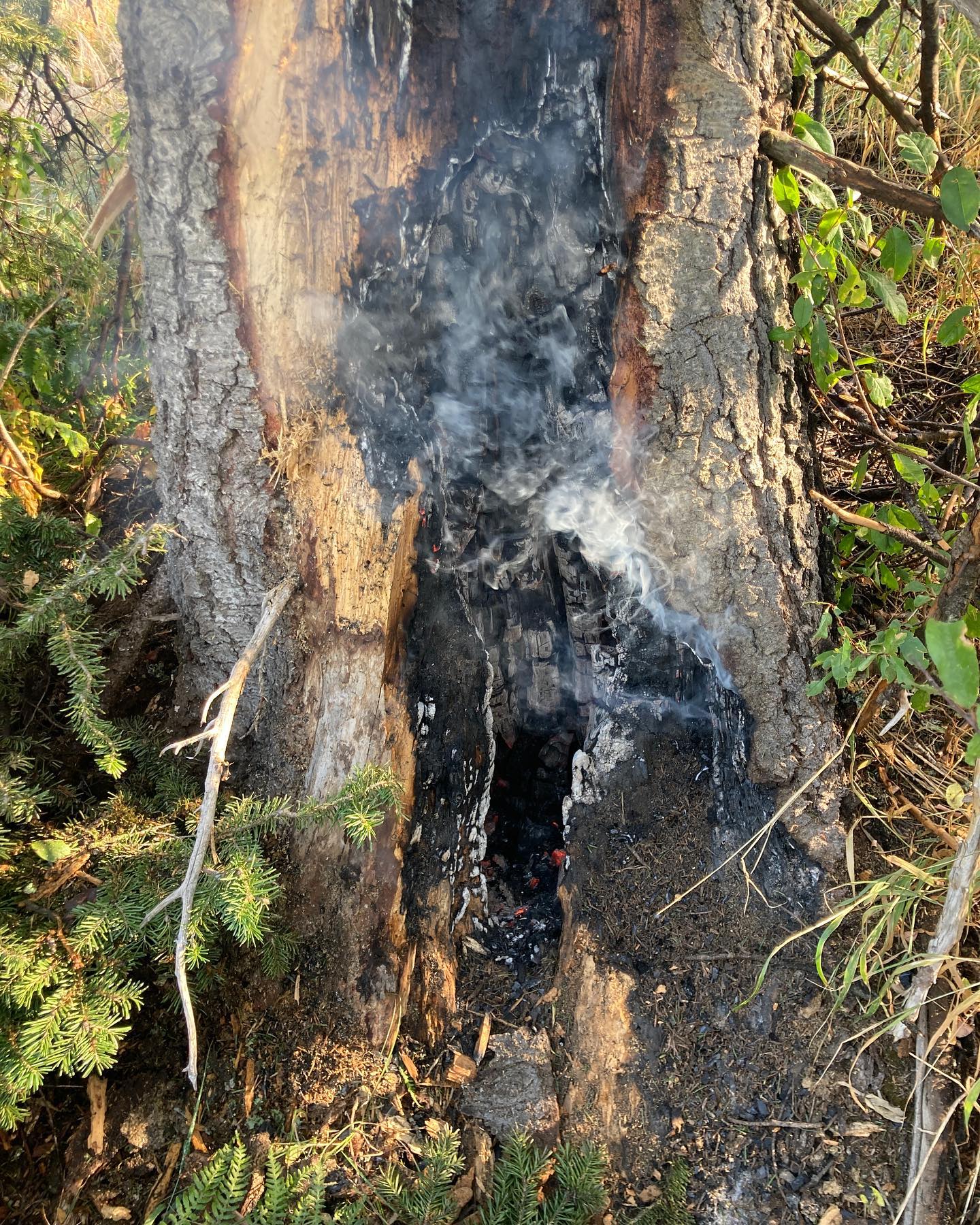 Buddy Bill: not all heroes wear capes! On our spin up Mt Spokane this morning Bill spied a column of smoke a few hundred feet down the side of the mountain. Turns out it was a smouldering lightening strike. Pics here don’t show the red cauldron of coals at the base of the tree— I filled it up with dirt before taking good pics. We called 911. We waited. Fire folks came. We finished the climb. Without Bill’s eagle eyes and cat-like reflexes, all of Mt Spokane would’ve burnt down. Verily.