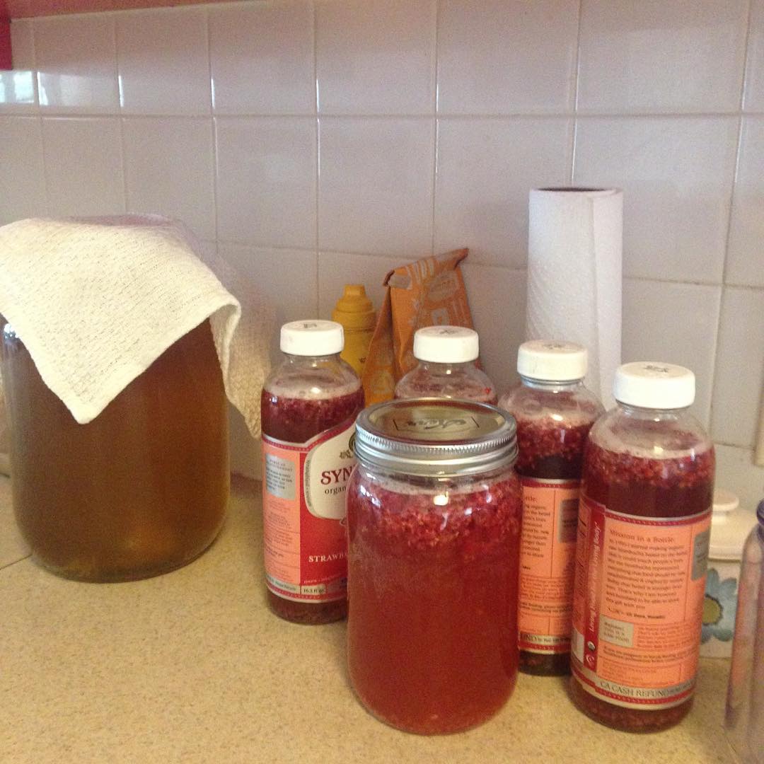 We burn through the 'bootch this time of year. Last batch: rhubarb (my favorite), this batch is raspberries, on deck is lavender. All from the neighborhood. #kombucha #loveyourmother