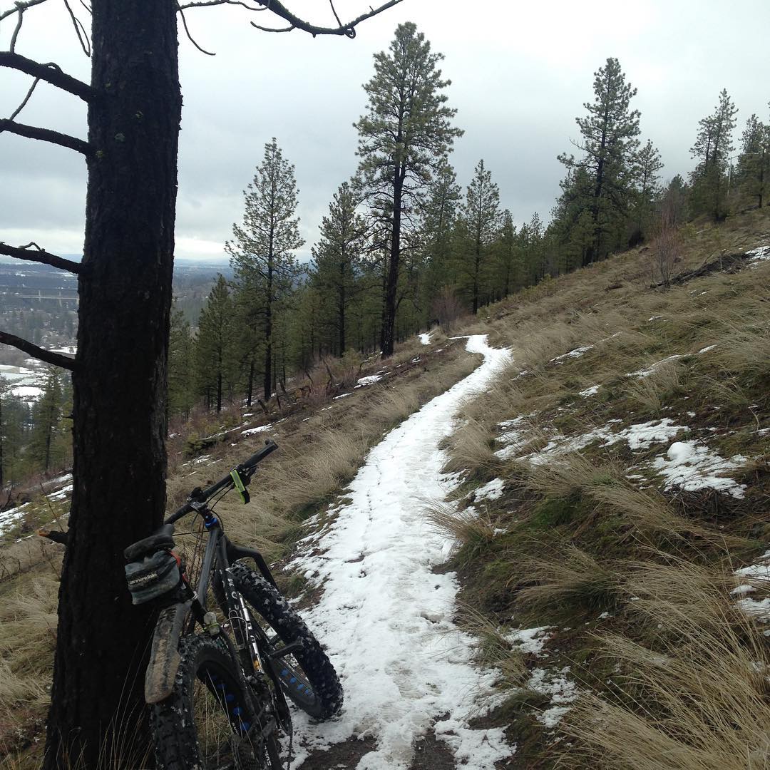 #highdrivetrails soft snow. bits of compact ice. clear bits on the west-facing exposed slope. I'm going go down to middle trail on tomorrow's #lunchride. it's still #fatbike conditions for me. #somasandworm