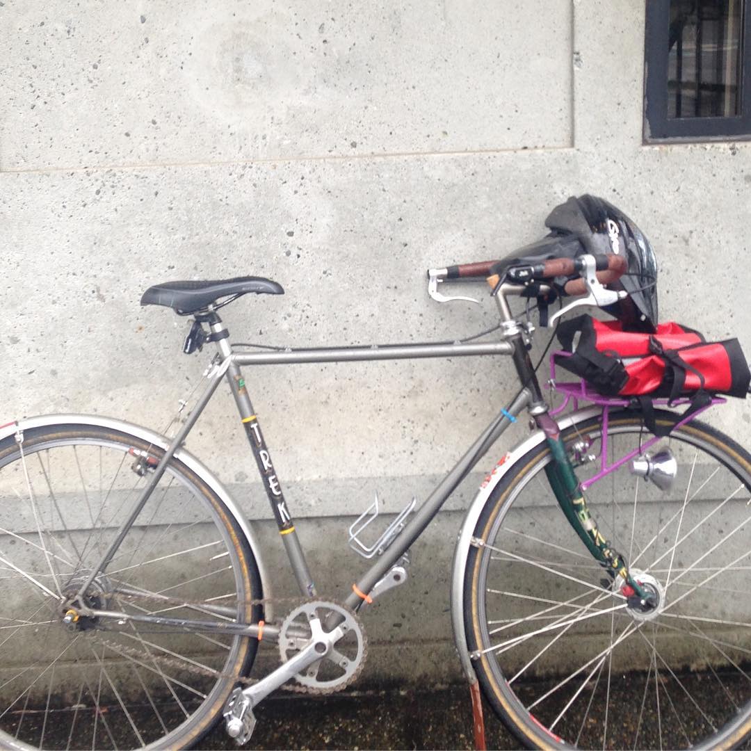 you can (and should) poo-poo the saddle and fender line, but you can't deny the hacked porteurtude of the '83 720. gen hub, internal hub, pat/john-made alex rack, lyons high-rake fork with custom patrick appliqué. damn straight! #loanerforlife