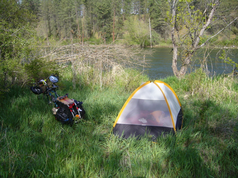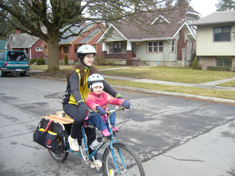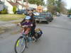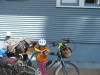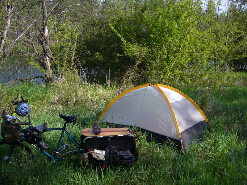 One bit that I really need to figure out is a better stand system for it. The kick stand that it ships with is really beefy and works well if you just want to stand it up for a minute. But the kick stand is not optimal if you are loading it up with groceries or if Maddie is stitting on the child carrier. The stand that xtracycle sells looks ok, but I think I found a source for a better-designed and built stand. Once I get it, I'll post pics. Maddie and I took our first camping trip together on the xtracycle on May 12th. Here's what we brought: giant sleeping bag; one wool blanket; 2 thermarest pads; 3 small pillows; tent; one small bag of clothes for Maddie; one small bag of food; first aid kit; tool kit; various small bits: silverware, flashlight. The campsite was about 13 miles away. We took our time getting there and we had a wonderful time. The campground was full, so we had to follow some old trails down the river and do some gorilla camping. The xtracycle is ideal for this. 800 x 600 / 2048 x 1536 updated 07/06 I bought a center stand from a fellow named Val in Seattle who has designed a great stand for the xtracycle. I installed it about a week ago and I've been using it and loving it ever since. This stand is especially wonderful when loading groceries. If you just use the regular kick stand then loading or unloading a heavy item on one side of the bike can cause the bike to fall over. Xtracycle sells center stands, and I've not used it, but I know it requires fussing to deploy. One important feature I want in the center stand is to make it as easy to use as the kick stand. The stand I bought is deployed by a brake-lever-actuated pully. You pull on the lever, the legs swing down, and you tip the bike back as you would a motor cycle. When it's time to go, you simply roll forward and go. Super simple, super non-fussy. The feet even have adjustable platforms for parking on uneven ground. This thing rules. Oh yeah... and one more thing, the "rock sturdy" stand sold by xtracycle won't work with wide loaders, but Val's stand does. You too can own one of these stands. Email Val Kleitz (he's the fellow in Seattle that made the stand). His email address is "instigator AT thebikesmith DOT com". I don't have any finacial interest in you buying one of these stands. I'm just a satisfied customer passing on the word. Here's a great picture of Val with his xtracycle and his bullwhip. I've never met the guy, but just judging from this picture, he seems like a good egg.